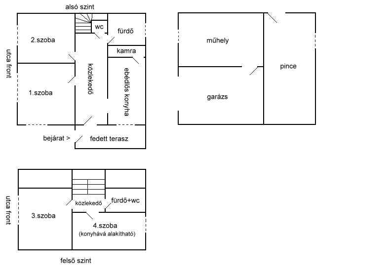 | Egyéb helyiségek | : alsó szint: fürdő, wc, ebédlős konyha, kamra, közlekedő | |